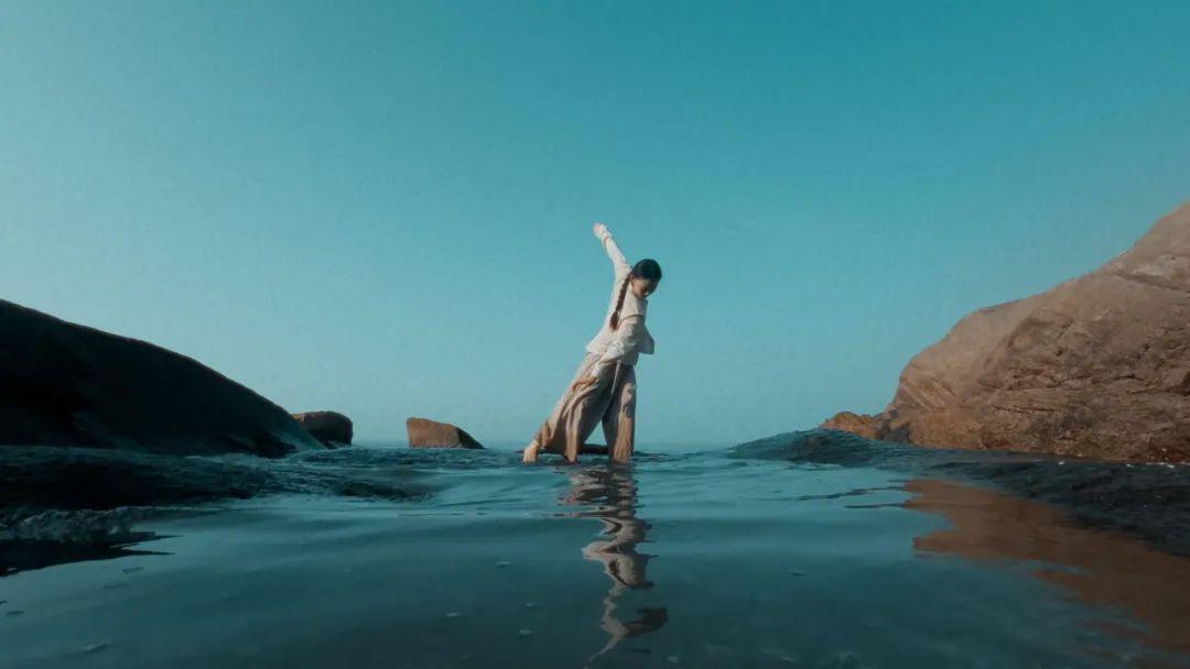 当踏出桎梏的第一步后, 镜头从逼仄的现实空间来到一望无际的海面,肌肤与礁石、潮水、沙粒的接触,赋予舞蹈一种原始的触觉真实。