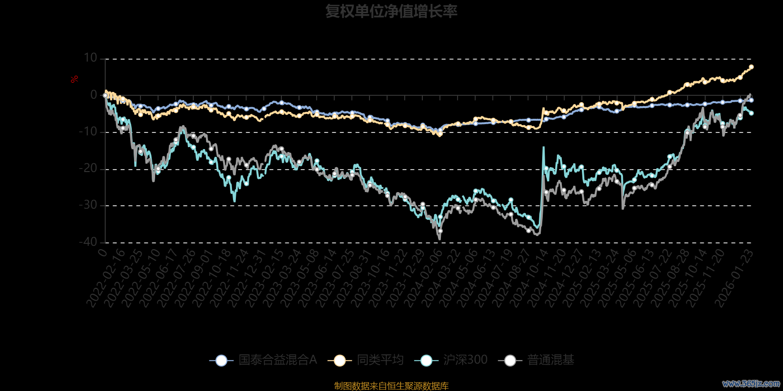 截至1月23日,国泰合益混合A近三个月复权单位净值增长率为0.96%,位于同类可比基金524/683;近半年复权单位净值增长率为1.40%,位于同类可比基金580/683;近一年复权单位净值增长率为2.17%,位于同类可比基金629/683;近三年复权单位净值增长率为0.47%,位于同类可比基金566/617。