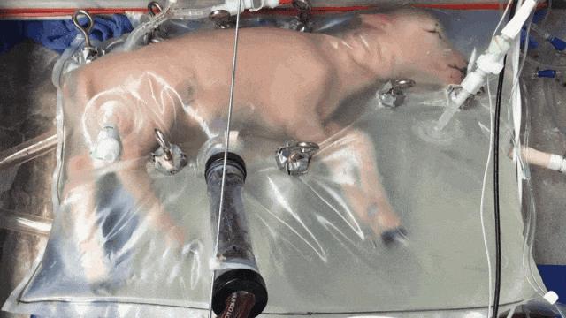 它将羔羊安置在一个聚碳酸酯制成的袋子里,袋中充满模拟羊水、用于维持渗透压的人工液体。研究人员通过脐带和颈动脉,将羔羊的血液循环与外部系统连接。这个外部循环装置一方面持续向羔羊输送氧气和营养,另一方面负责清除代谢废物。