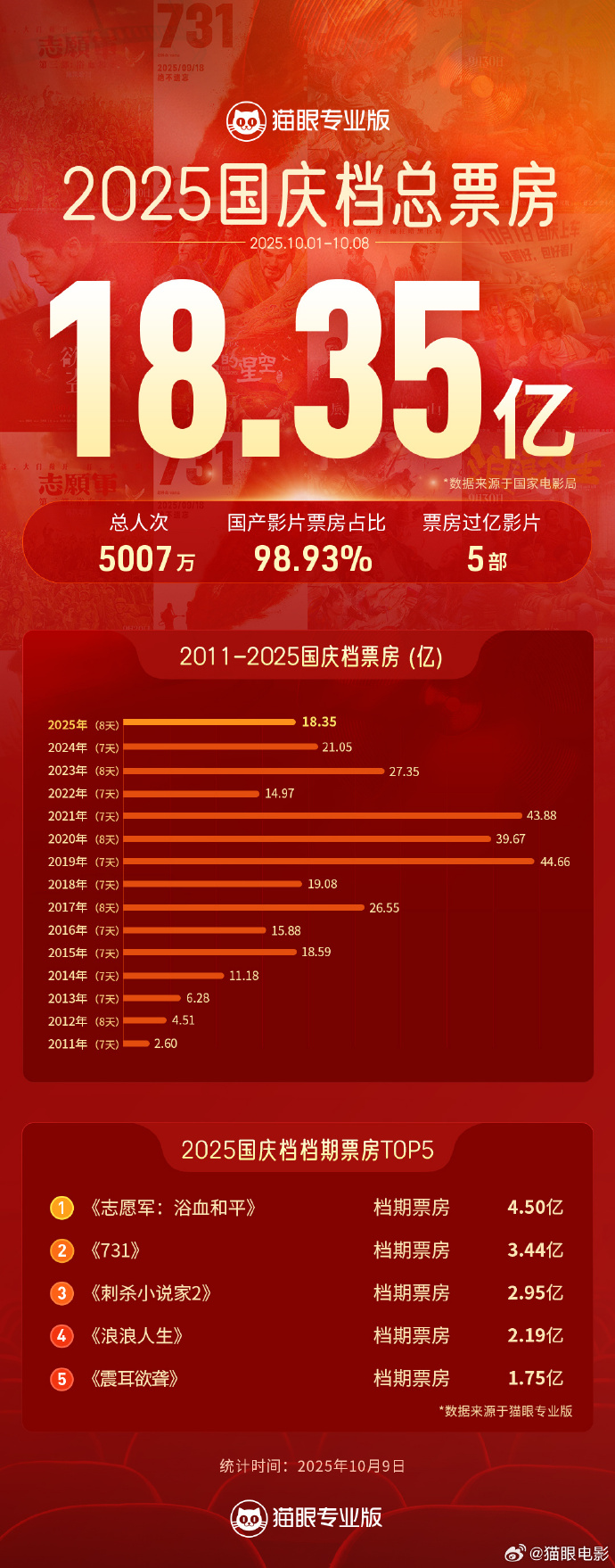 另据猫眼专业版数据佳荣网配,今年国庆档平均票价36.6元为近五年最低。票房前五名的影片分别为《志愿军:浴血和平》4.50亿、《731》3.44亿、《刺杀小说家2》2.95亿、《浪浪人生》2.19亿、《震耳欲聋》1.75亿。档期内共5部影片破亿,破亿影片数量与过去两年国庆档持平。
