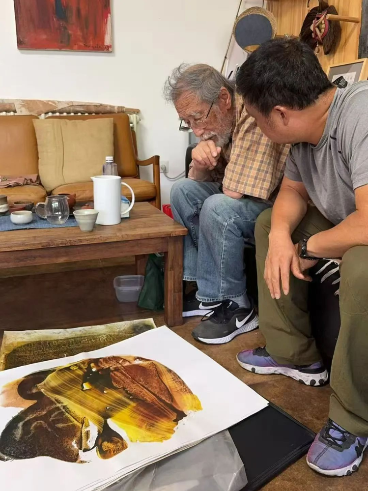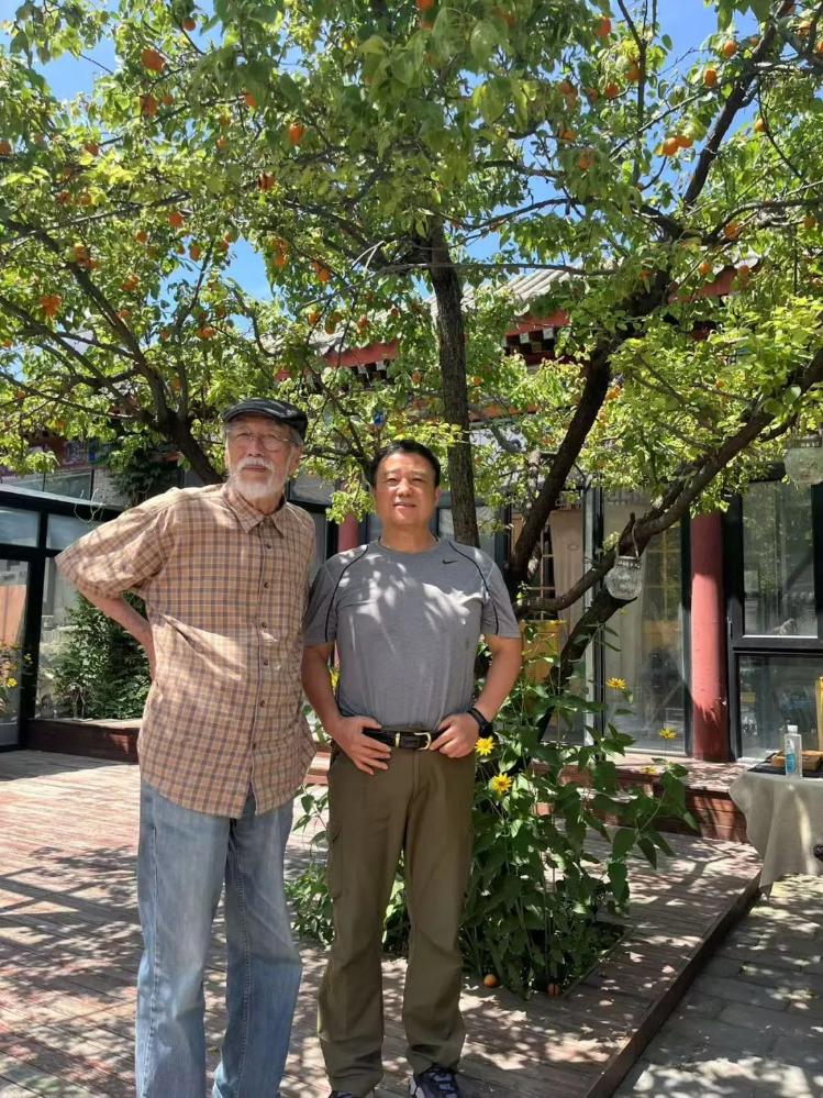 怀柔溪谷风情深处,小院杏树亭亭如盖焉,枝叶间累累果实已染成金黄,沉甸甸垂落,微风过处,光影便在树下的长桌旁婆娑起舞。晨风携着清冽气息拂过,恩师广军先生(中国美术家协会版画艺委会原主任、中央美术学院版画系原主任)端坐其间,白发苍苍戴着鸭舌帽,面色红润,精神矍铄如劲松。他早早备好了杏儿,甘甜滋味浸入舌尖,仿佛融进了岁月的醇厚。恩师笑问我年岁四十几?我答六十三,他恍然笑道:“你也会六十三了?”岁月之河奔流不息,却似未能在广先生身上刻下过多痕迹,除了那如霜的须发,他精神饱满,神清气爽,侃侃而谈,诲人不倦,仍如当年目光如炬,洞察毫厘。