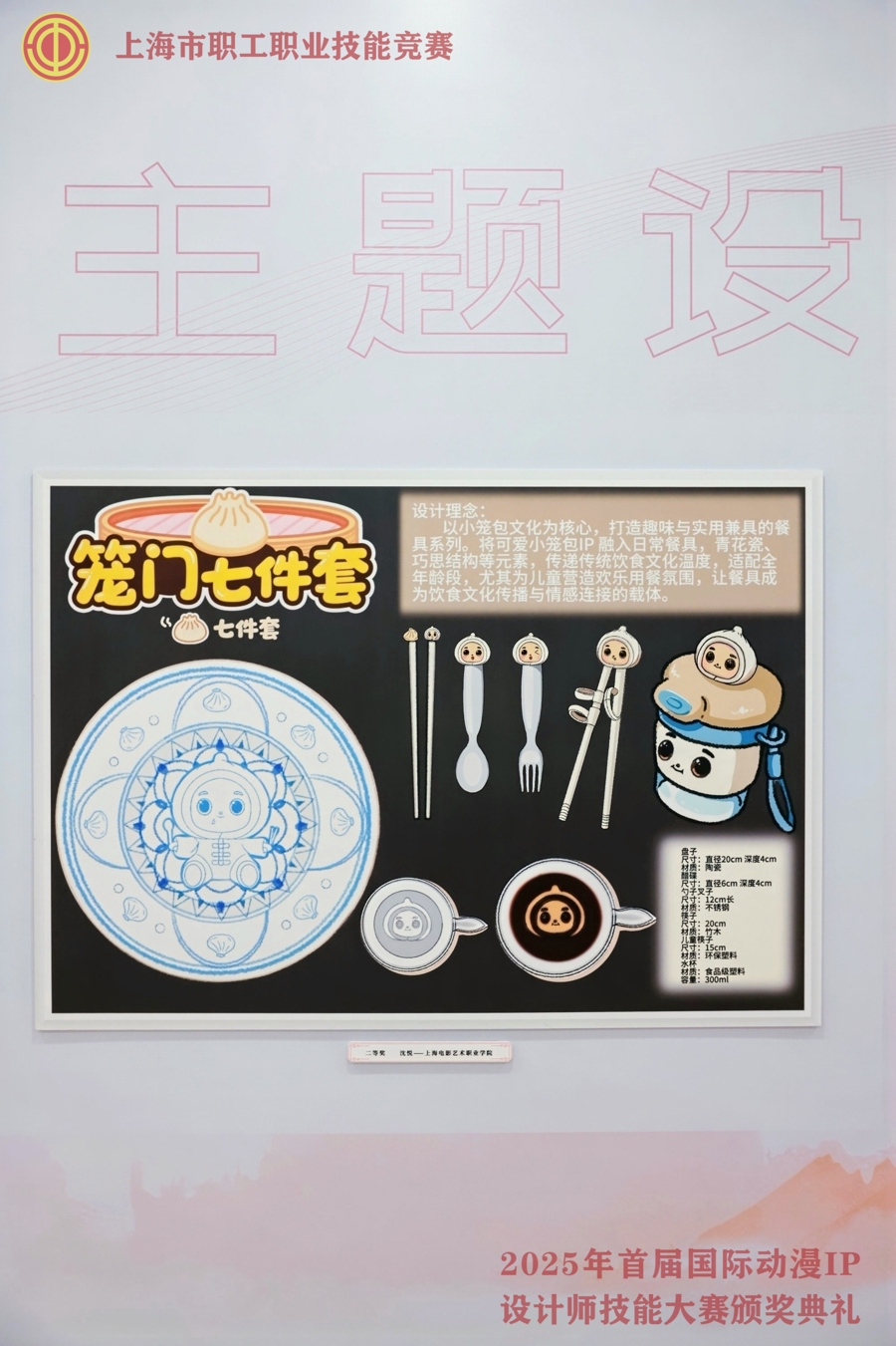 展览现场,两大展区生动诠释大赛内核,技能比武区的“职业工人IP”以质朴线条传递“劳动创造美”的工匠精神,而主题设计区的“南翔小笼”形象则融合产品传统纹样,展现非遗在动漫语言中的新生。这些作品不仅是技艺比拼的成果,更是南翔“国潮第一镇”战略的具象表达。去年来,南翔通过MetaGuochao元宇宙峰会推动AR皮影戏、文旅AR等技术赋能非遗,依托“一核两区两廊”规划,将古镇转化为传统文化数字化的超级实验室。