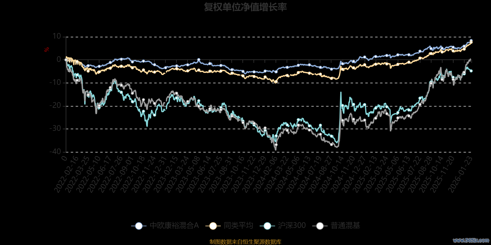 该基金属于偏债混合型基金。截至1月23日,单位净值为1.324元。基金经理是黄华和李波,目前共同管理的2只基金近一年均为正收益。其中,截至1月23日,中欧达益稳健一年混合A近一年复权单位净值增长率最高,达8.6%;中欧康裕混合A最低,为7.92%。