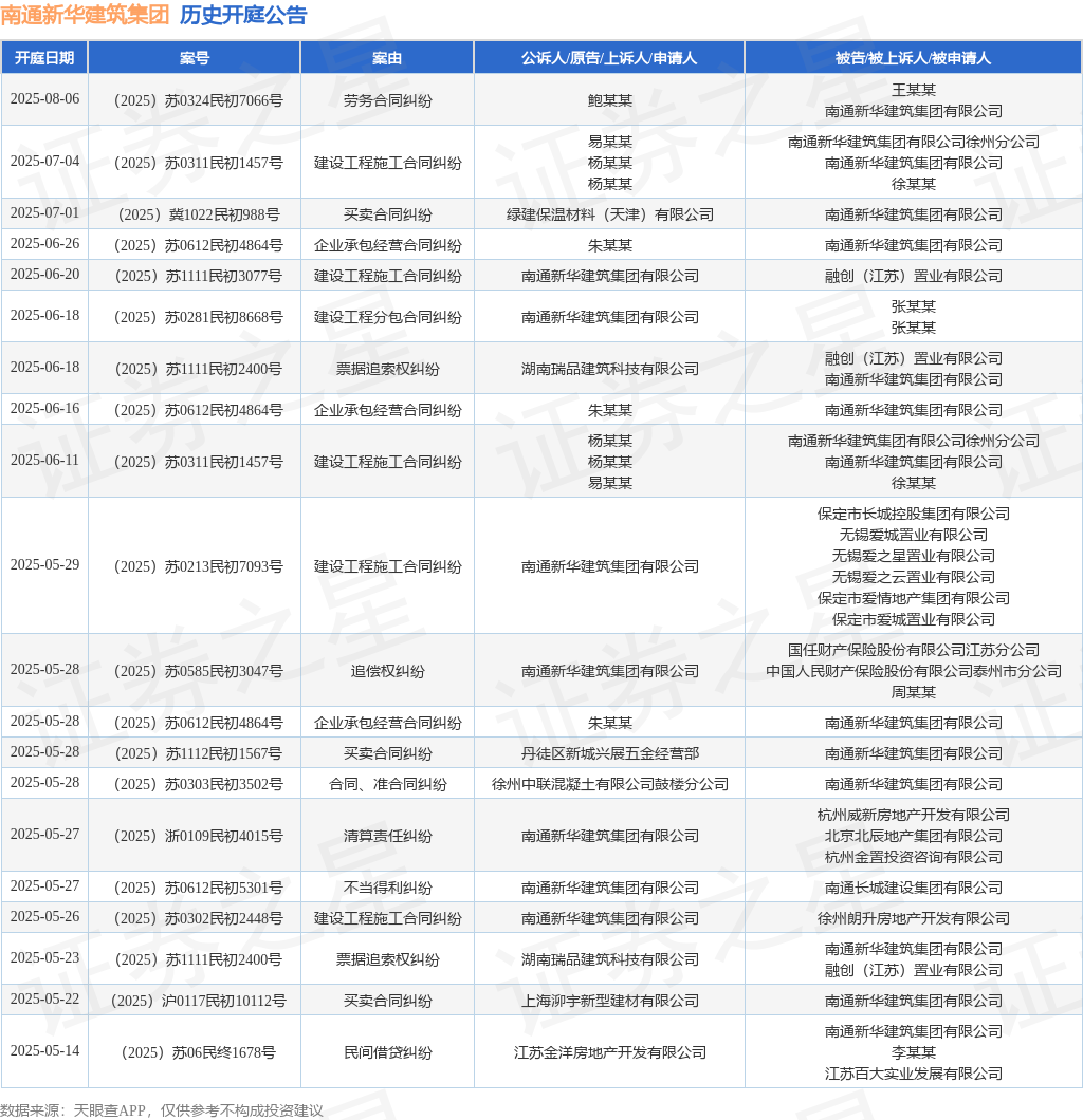案号:(2025)苏0281民初8668号审理法院:江阴市人民法院案由:建设工程分包合同纠纷当事人信息: 原告/上诉人:南通新华建筑集团有限公司 被告/被上诉人:张某某、张某某开庭日期:2025年6月18日根据统计,近一年内以南通新华建筑集团有限公司为当事人的历史开庭公告有244则,其中案由为“建设工程施工合同纠纷”的公告以75则居首,其次为“买卖合同纠纷”有33则,“建设工程分包合同纠纷”有31则。历史开庭公告(前20条)如下: