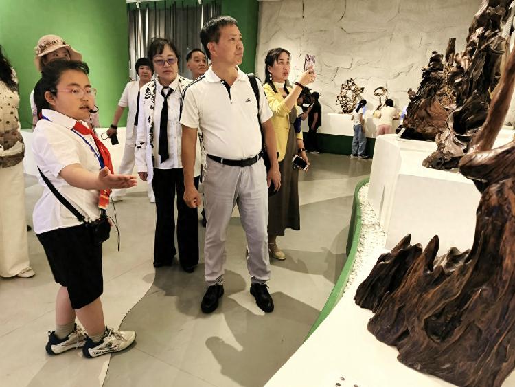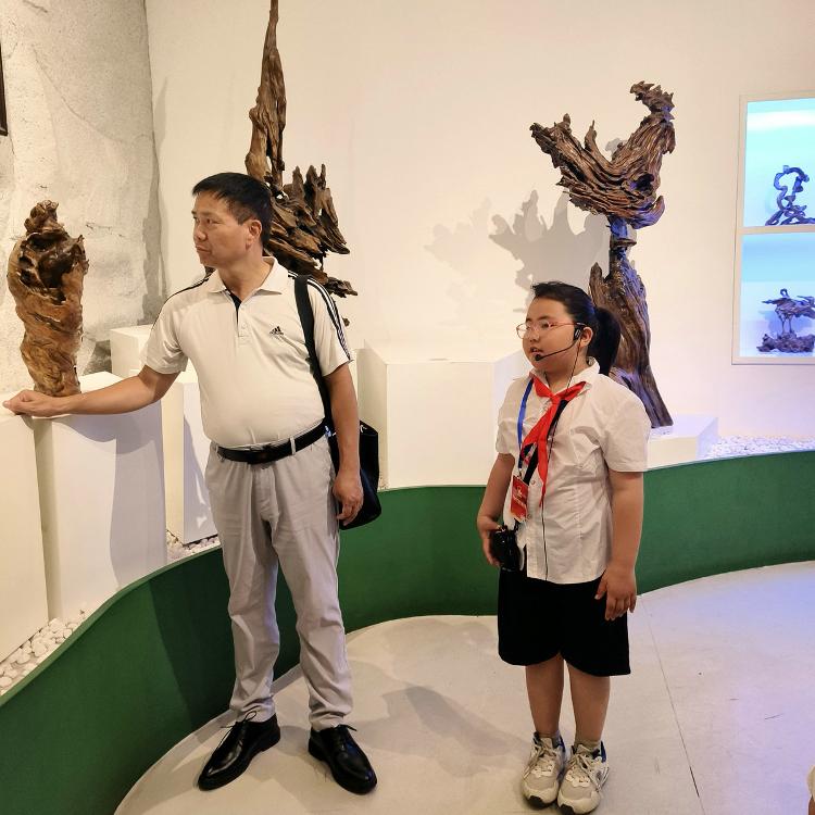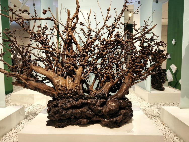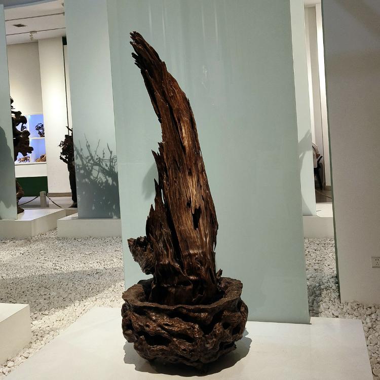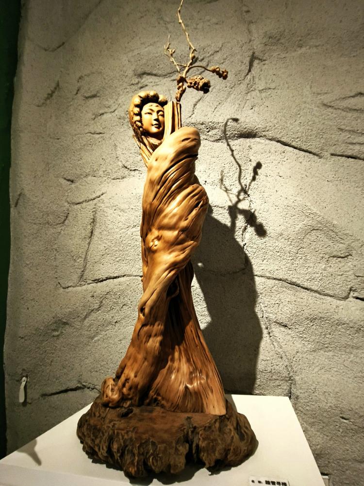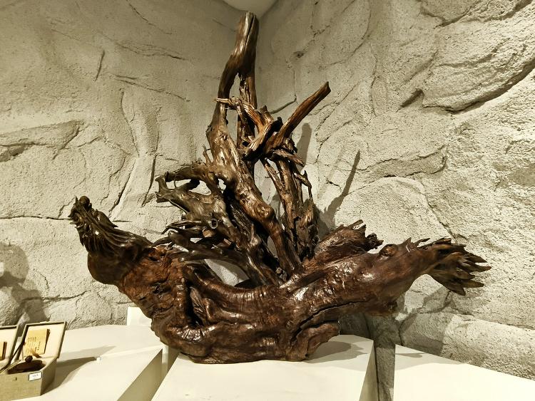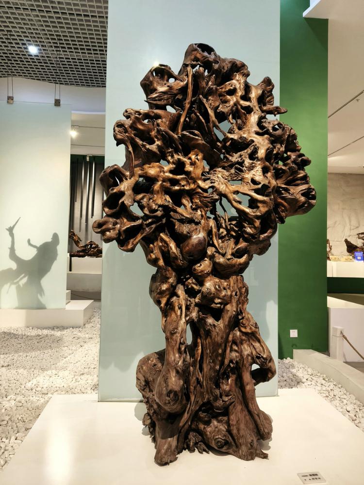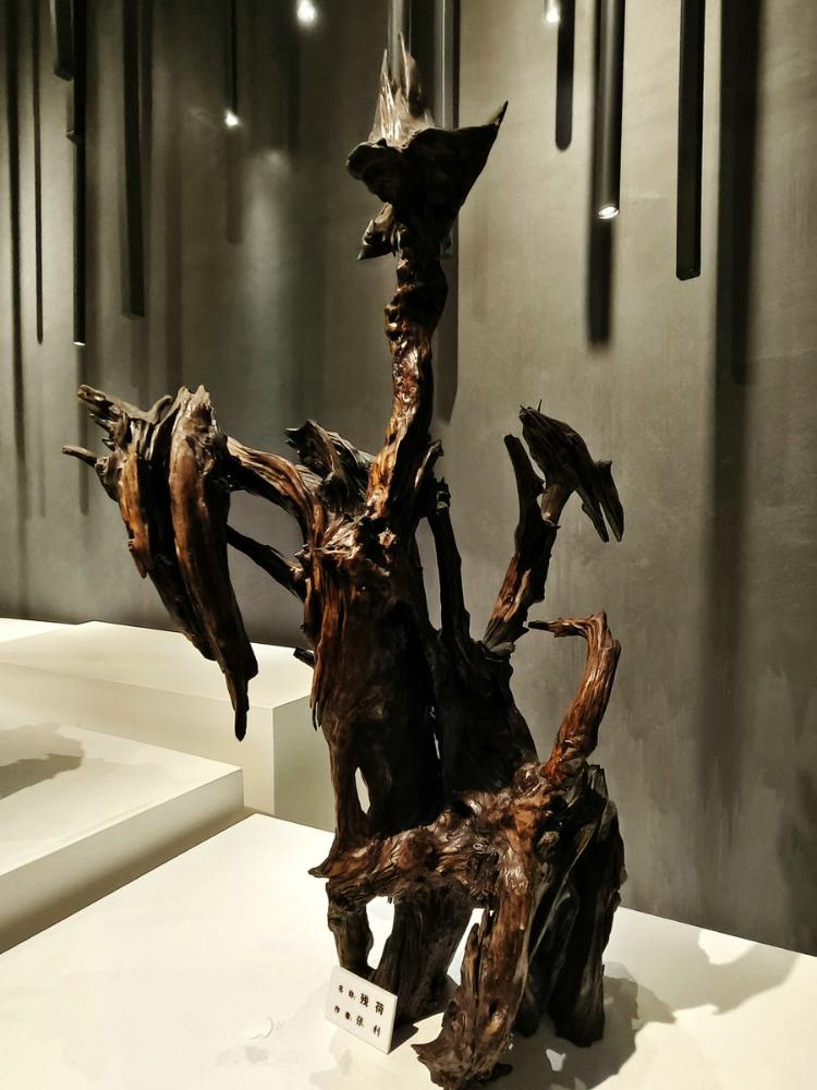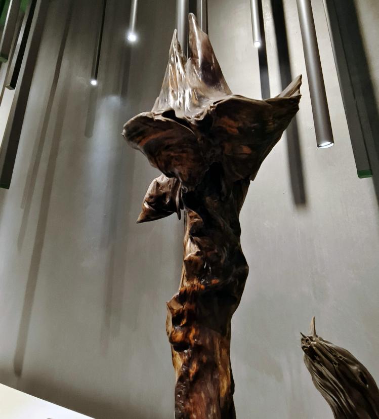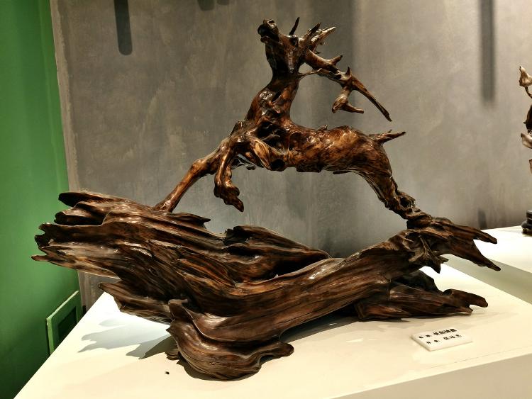 可以想见,根雕匠师们面对每块浪木,如承接大地托付的信物。他们俯身凝眸于虬结盘缠的根须之下,手抚木筋上的深深纹路如抚摸岁月的沧桑皱纹,寻找自然蕴藏的玄妙旨意——那些卷曲翻涌的木纹,或天然生成的“鬼脸”,皆为命运藏下的神秘锁钥。艺人们以心接木,以手为语,不再仅仅是“刻”与“凿”,却是虔诚的“发现”与“破译”。刀锋过处,是松花江水刻于木理筋骨之中的印痕渐被呈现;当根壳剥去伪装,浪木深藏的生命,竟借艺人之手终绽奇艳奇葩,在人的视野里发出惊绝的光采。