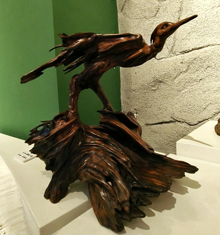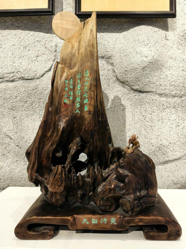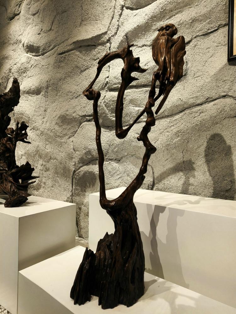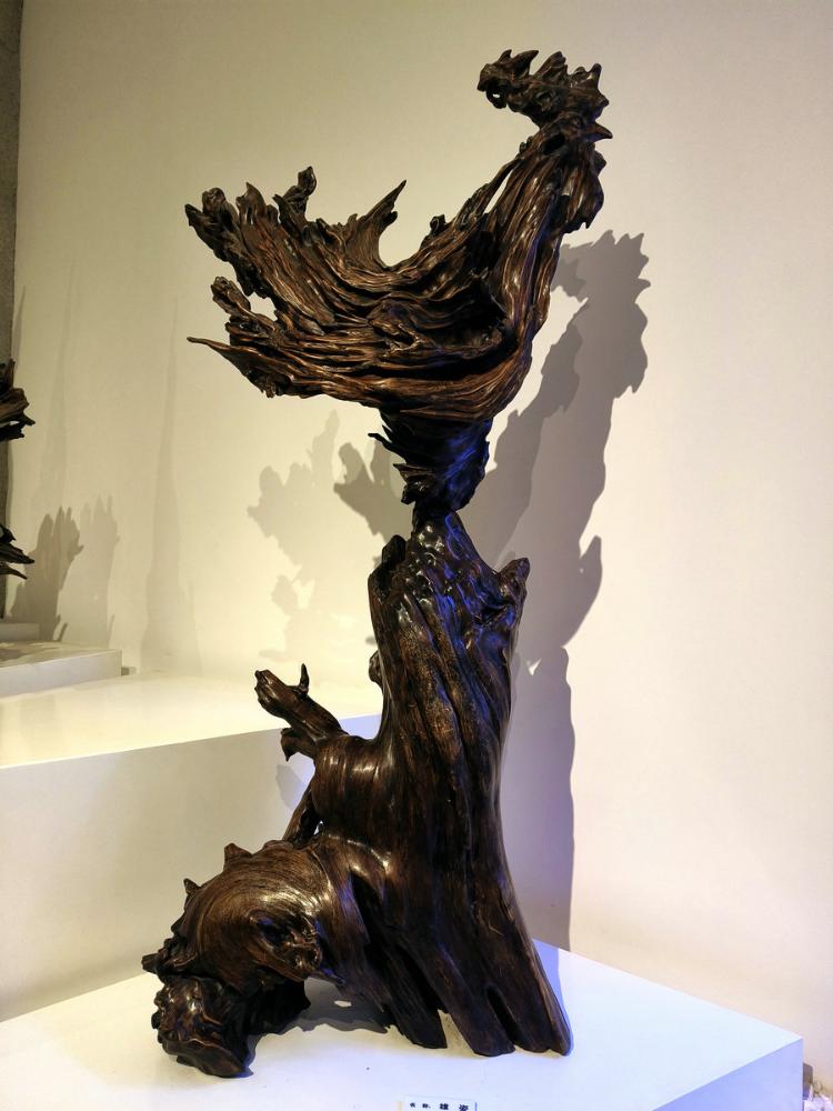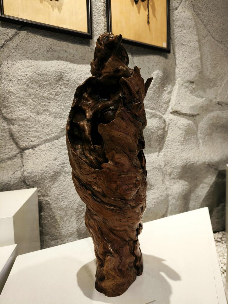 由材料到技法都显出浪木根雕不可仿制的禀赋。因自然塑造而非雕琢的千奇万态的木纹变幻之美万无优配,赋予了每一件作品独特气质;顺木材天生姿态而创作的原则更契合了“随形造势”的艺术真谛——老艺人讲求“三分人工七分天成”,因势利导如同江水般依着地势奔流;而浪木在时光之河长年浸润与磨砺,使它异常坚实厚重,木质沉实入水,颜色自然古意,握之有铜铁般冷然之感。此种材质纹理美、形态美、材质美,如天作之合,共同构成浪木艺术品魂魄的基调,使得它迥异于那些出自人工种植木料上的刻意雕琢。