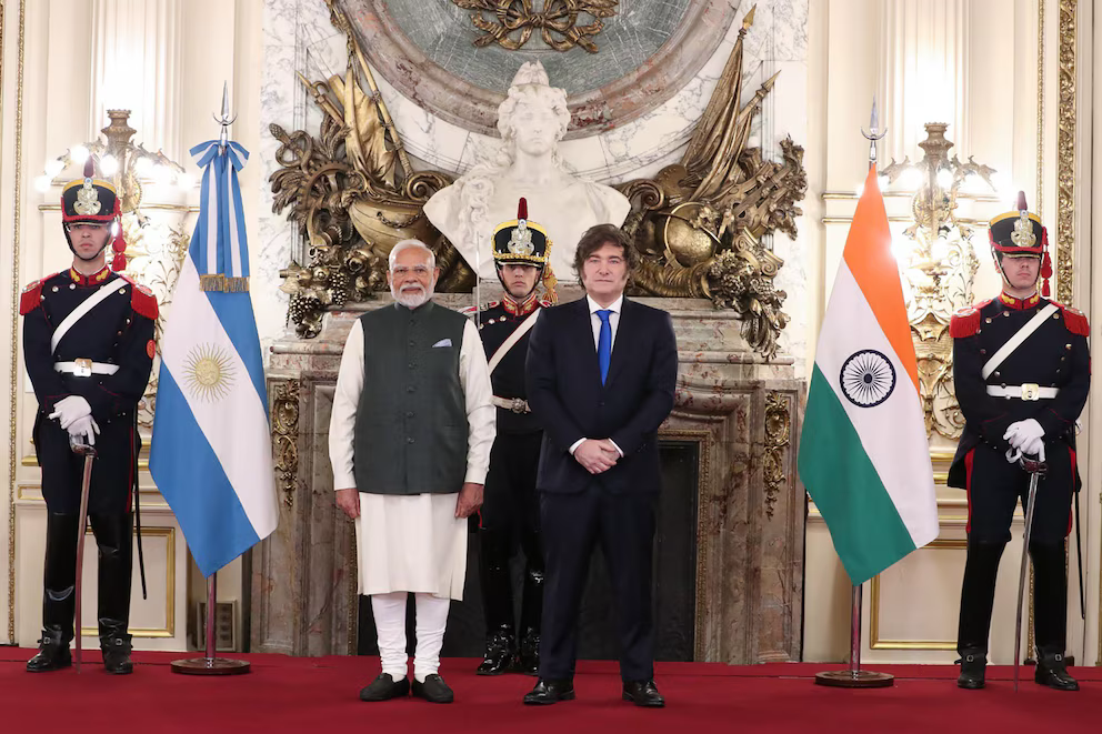5日,阿根廷总统米莱在总统府会见了莫迪(上图),两人的会谈议题主要集中在农业、锂矿、能源和核能等战略领域的贸易合作。