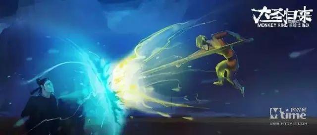 导演点评:悟空战斗时、身上封印燃烧时、空中挥棒时都是金色,是个金光闪闪的英雄形象。混沌是反派,代表的是阴柔的那一面。所以用了阴冷的蓝色。该图比较忠实于我们的原意。这张图的动画做好后,美术师在动画上直接上色,看看加上特效后的光影效果如何。