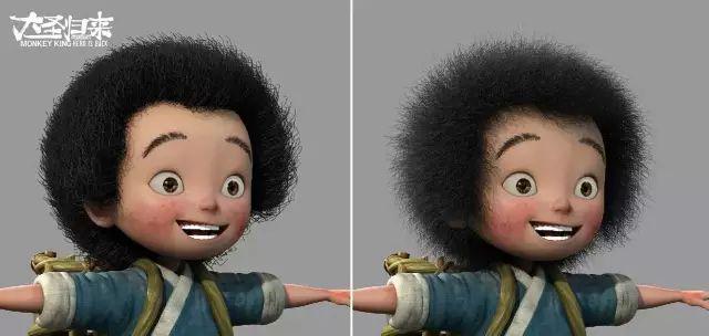 导演点评:这两个头型属于“失败品”,我们想看看头发变长了以后是什么样子,想看看多长是观众可以接受的。做的过程中可能是毛发师不经意的一个动作,渲染时直径选大了,不小心就变成爆炸头了。