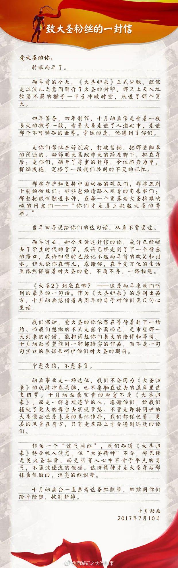2017年,《大圣归来》官方微博曾发布过一封写给“大圣粉丝”的信,报告新片的最新进展。在信里提及“宁愿失约,不愿辜负”,我们知道《大圣归来》终会被人淡忘,但“大圣精神”不会。