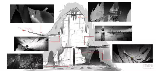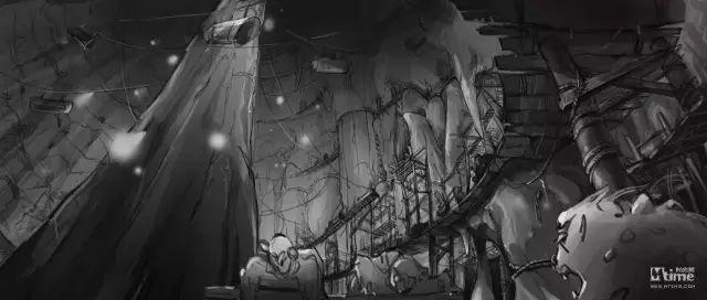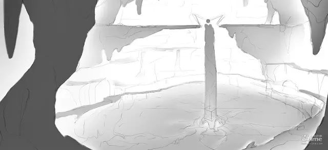 导演点评:混沌的山洞结构复杂,深不见底。我们本想设计镜头穿越山洞的炫酷主观镜头,像过山车那样,所以就把山洞做得高大复杂。但做完这段戏的分镜后发现过于复杂,而对剧情本身的推动又没有太大作用,就忍痛删掉了。