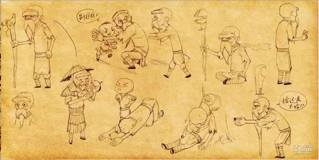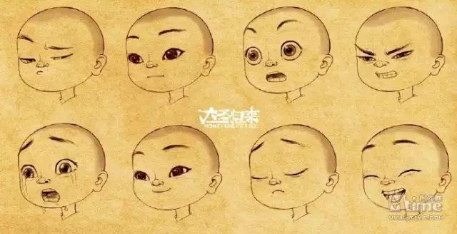 导演点评:图中只表现了小和尚江流儿常规的喜怒哀乐,在概念阶段不能画特别多的表情。更多的表情和表演是在动画阶段摸索出来的。我们希望江流儿是一个很纯真干净的孩子,不想要某些作品中那种小大人、五道杠式的孩子。我们参考了很多孩子的照片来设计。